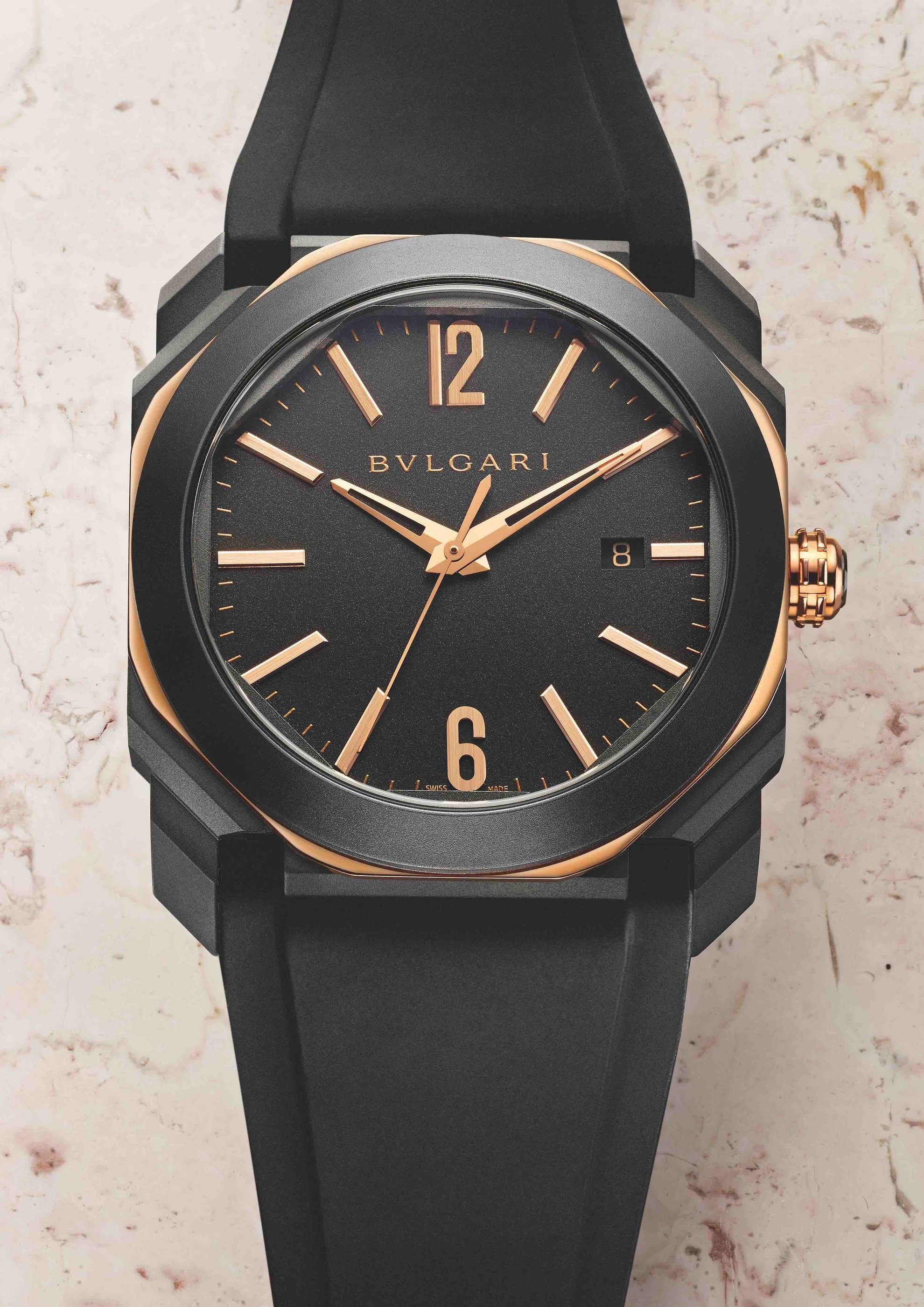 Mechanical manufacture movement with automatic winding and date. BVL 191 - Solotempo caliber decorated with Côtes de Genève, chamfering and snailed finishing. 42 hours power reserve. 41 mm sandblasted steel case treated with DLC, 18kt rose gold octagon. 18kt rose gold crown, transparent back case. Anthracite dial with 18kt rose gold hand-applied indexes. Integrated rubber strap treated with black DLC. Water-resistant to 100 metres.