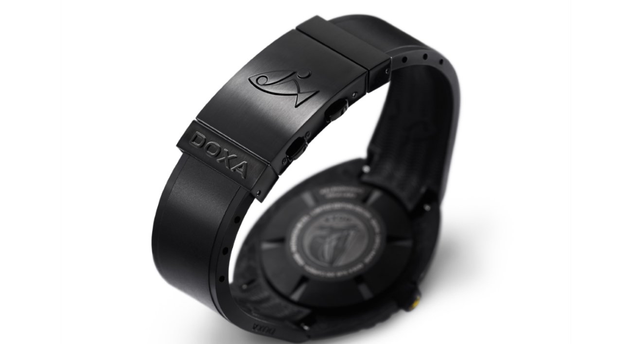 There is another distinguishing attribute: This is the first time Doxa employs a bright yellow minute hand. It’s the same yellow as the exclusive Aqua Lung logo placed at 7 o’clock. Next to it, the designation “SUB 300 Sharkhunter Carbon.” The watch is fitted with a black soft rubber strap for exceptional wear comfort, with a black PVD-treated folding clasp featuring the exclusive “Doxa fish” symbol.