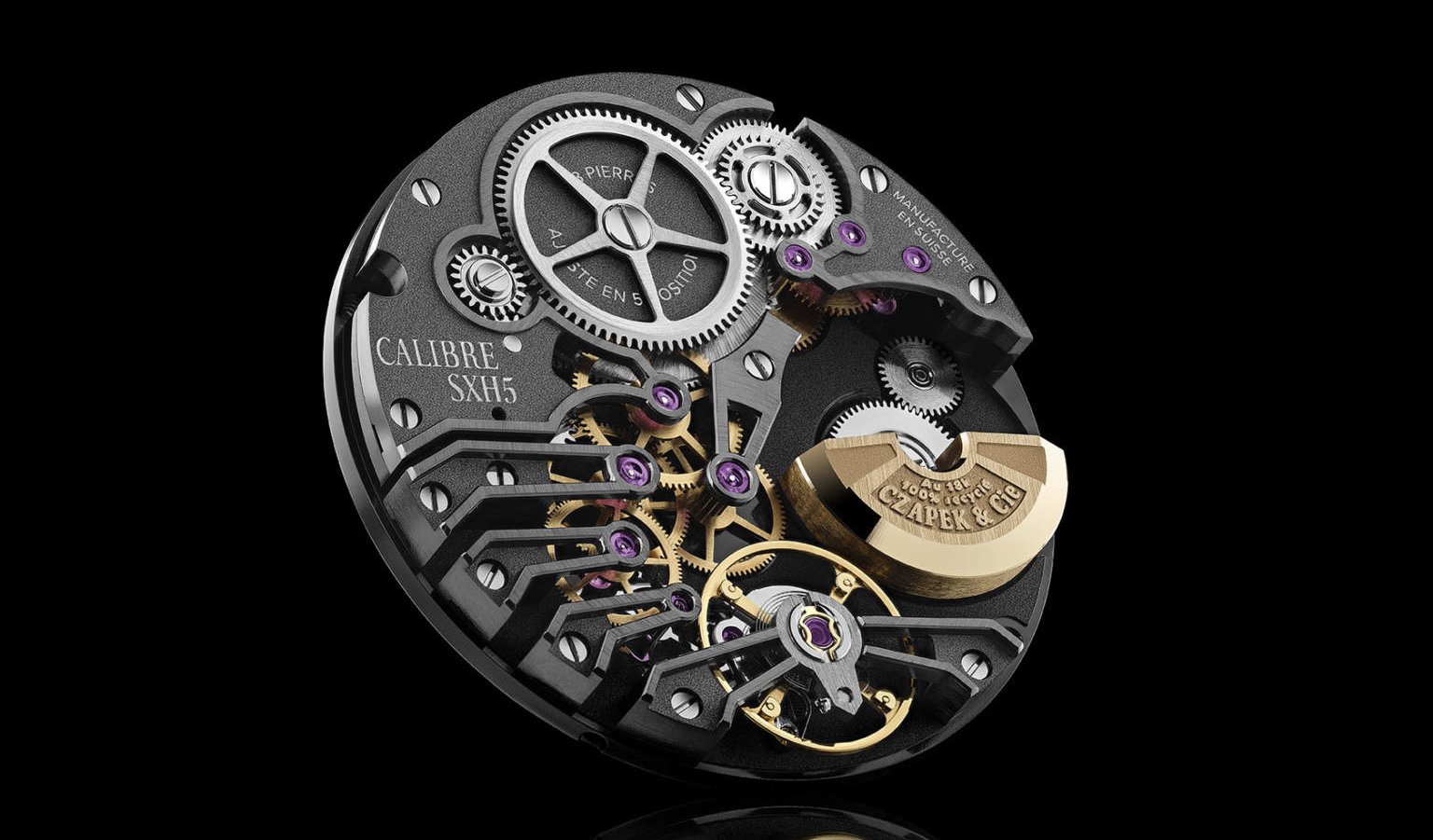 The architecture of the movement is also exceptional. At the root is a free-sprung balance wheel with variable inertia provided by four gold masselotte weights, which enables the highest level of precision tuning for a mechanical watch. The micro-rotor was manufactured in La-Chaux-de-Fonds out of a very special ‘fully recycled’ 18-kt gold supplied by AGOSI. It was placed off-centre to allow a plunging view into the mechanism. The SXH5.01 runs at a fast 28,800 vph. The single barrel harbours a flat spring wound via the traditional Czapek ratchet wheel with five arms. The timepiece has a power reserve of at least fifty-six hours, a truly remarkable feat for a micro-rotor. Waterresistance to 120 meters makes it a natural for the sportive types who would like to keep their watch on while swimming.