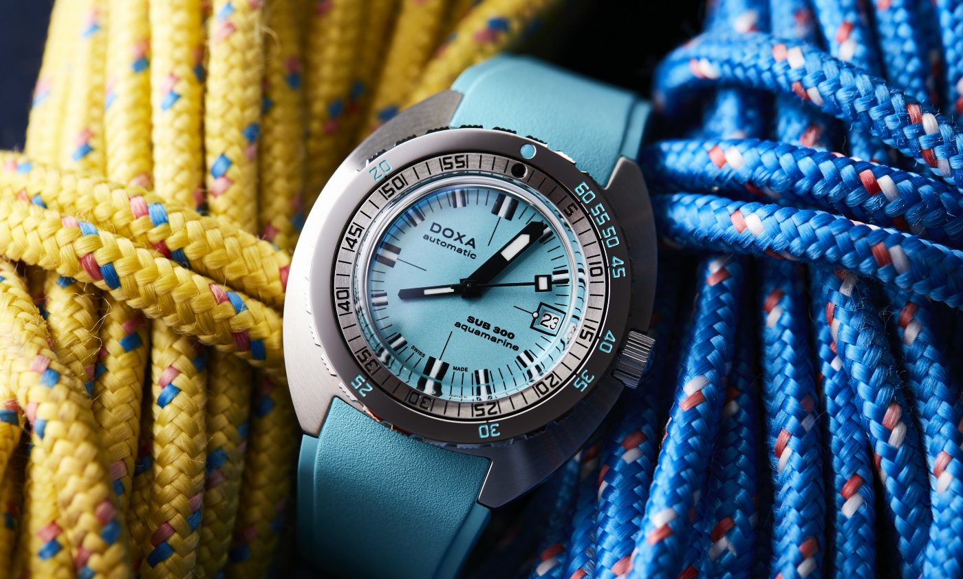 From 2020, the SUB 300 is available with flying colours: Orange Professional, Silver Searambler, Black Sharkhunter, Navy Caribbean, Yellow Divingstar, and Turquoise Aquamarine. Doxa also introduces coloured rubber straps for a tone-on-tone match with the dials, a first for its collections.