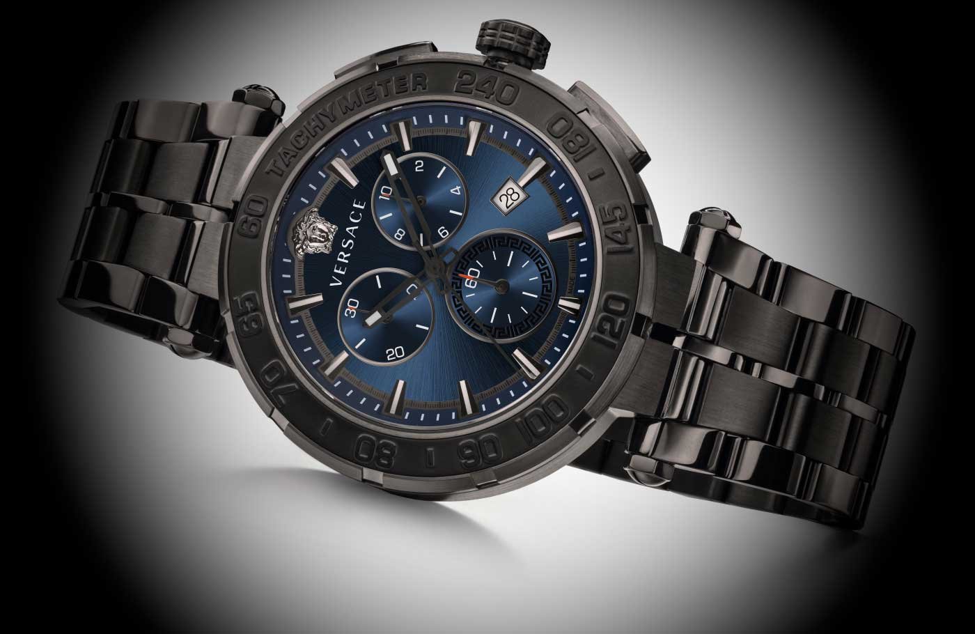 - Dial: Black or Blue w– Versace logo and Medusa at 12h