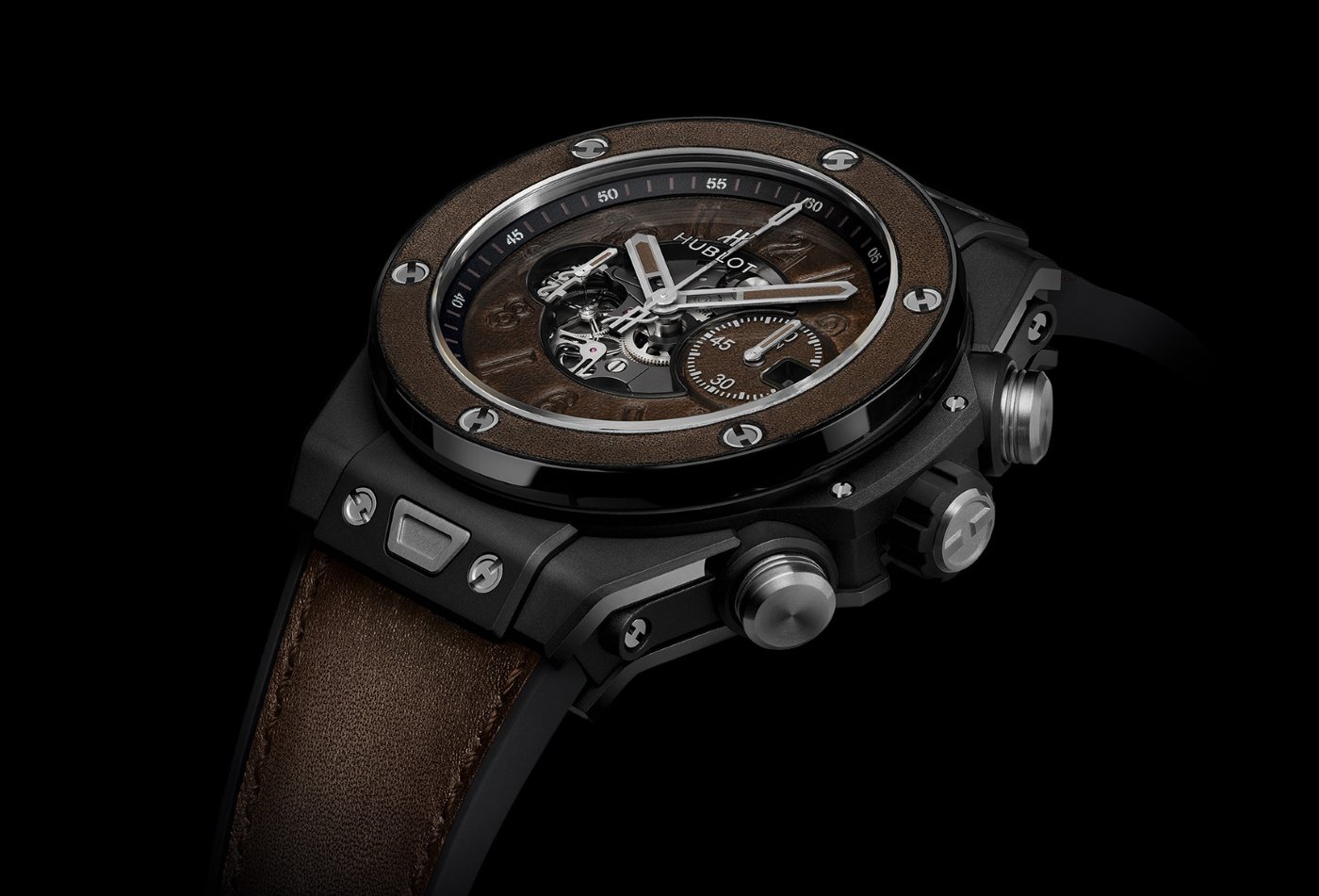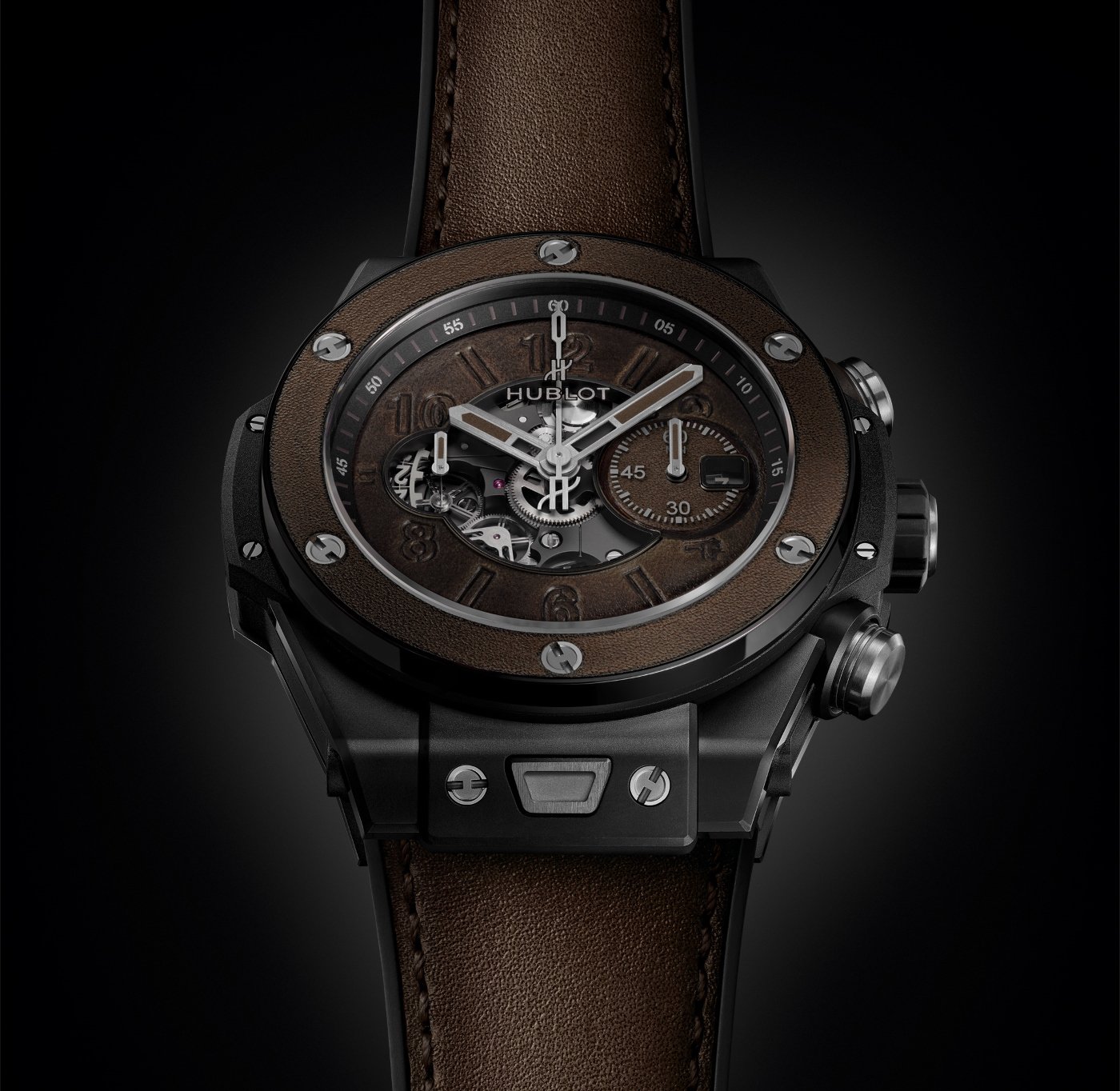 Thanks to a delicate process developed in collaboration with Berluti, the organic elements of the Venezia leather, which comes with the Cold Brown patina, have been encapsulated as if frozen in time, making the living beauty of the natural hide impervious to the rigours of age. At the heart of this 45 mm Hublot Big Bang, we find the iconic Unico manufacture movement, a chronograph with flyback function.