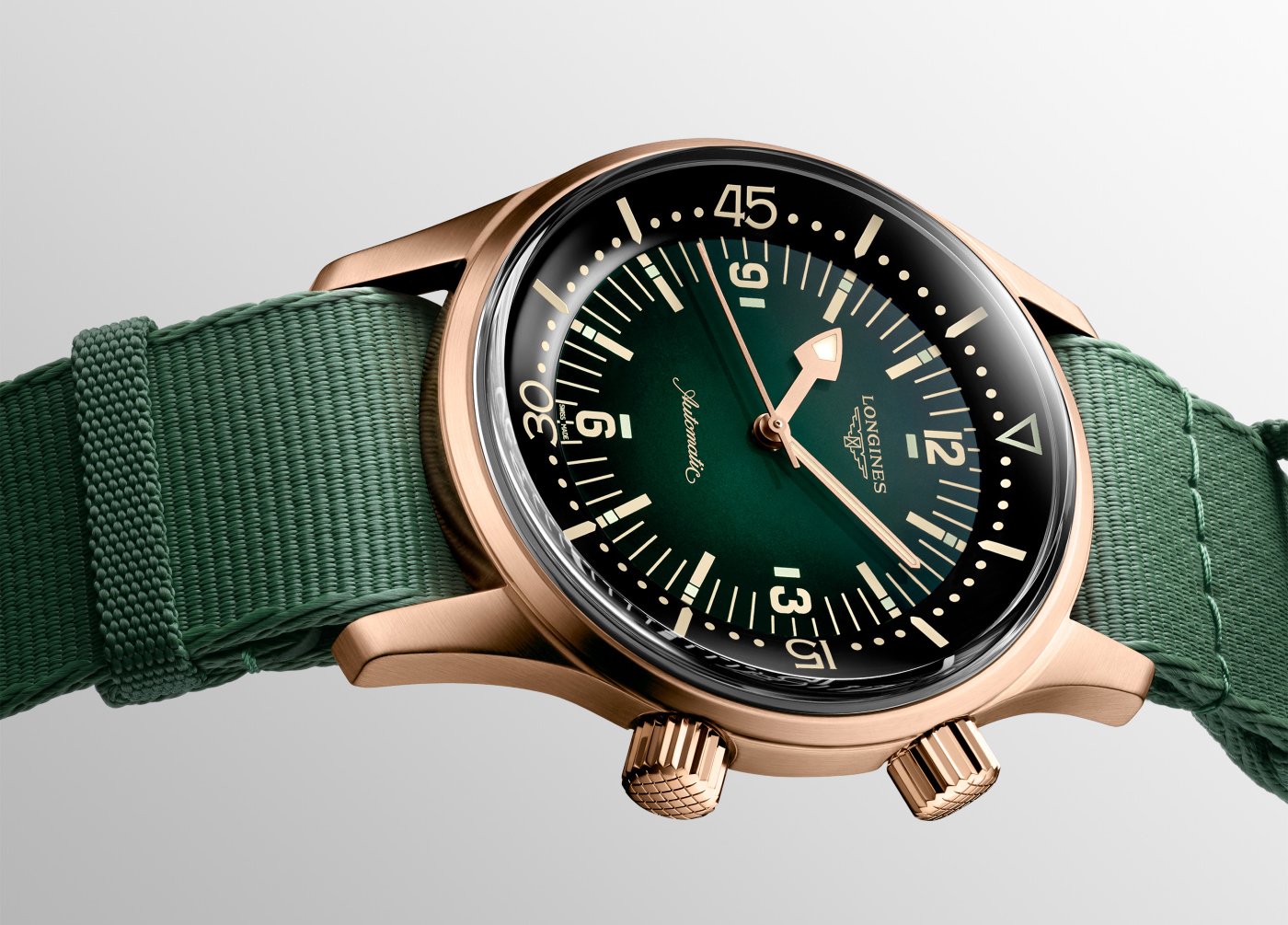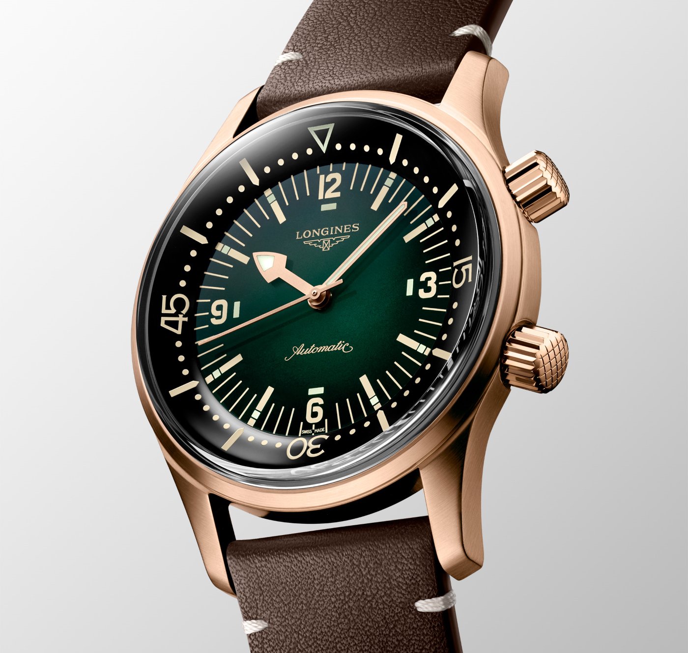The Longines Legend Diver Watch now features a bronze version. Its green gradient lacquered dial is covered with a sapphire box crystal and sports luminous hands, hour markers with squares coated with Super-LumiNova® and Arabic numerals enhanced with a luminescent rectangle. The watch is paired with a brown leather strap finished with beige stitching, and comes with a second strap in green NATO-type nylon.