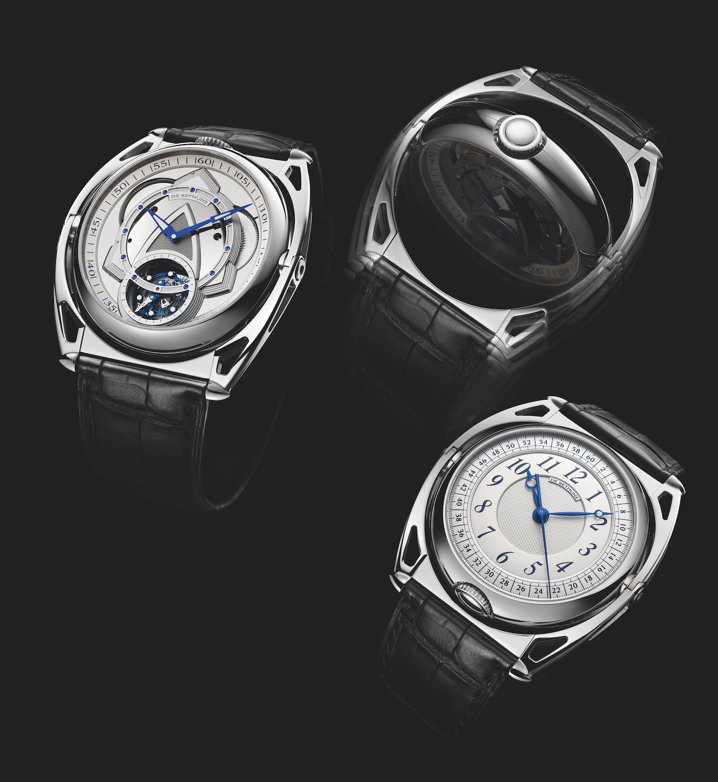 The second face is a dial of absolutely classical inspiration, with a hand-guilloché centre and central hours, minutes and seconds hands.