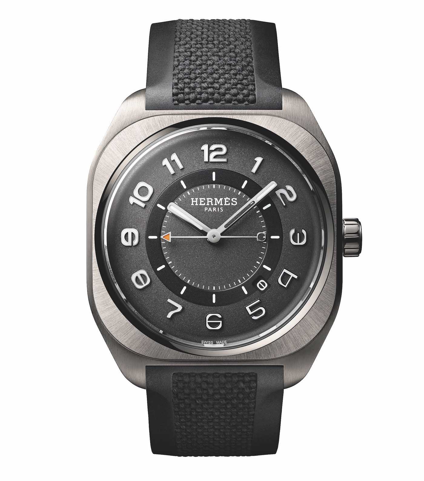 Two other variants – the first in matt black DLC-coated titanium and the second in satin-brushed titanium – frame a black nickel-coated dial and are teamed with a blue or black webbing band, or a black or orange rubber strap. In addition to its toughness and comfort, the woven strap specially developed for the Hermès H08 watch epitomises a style that is as sporty as it is sophisticated, entirely consistent with the world of Hermès menswear.