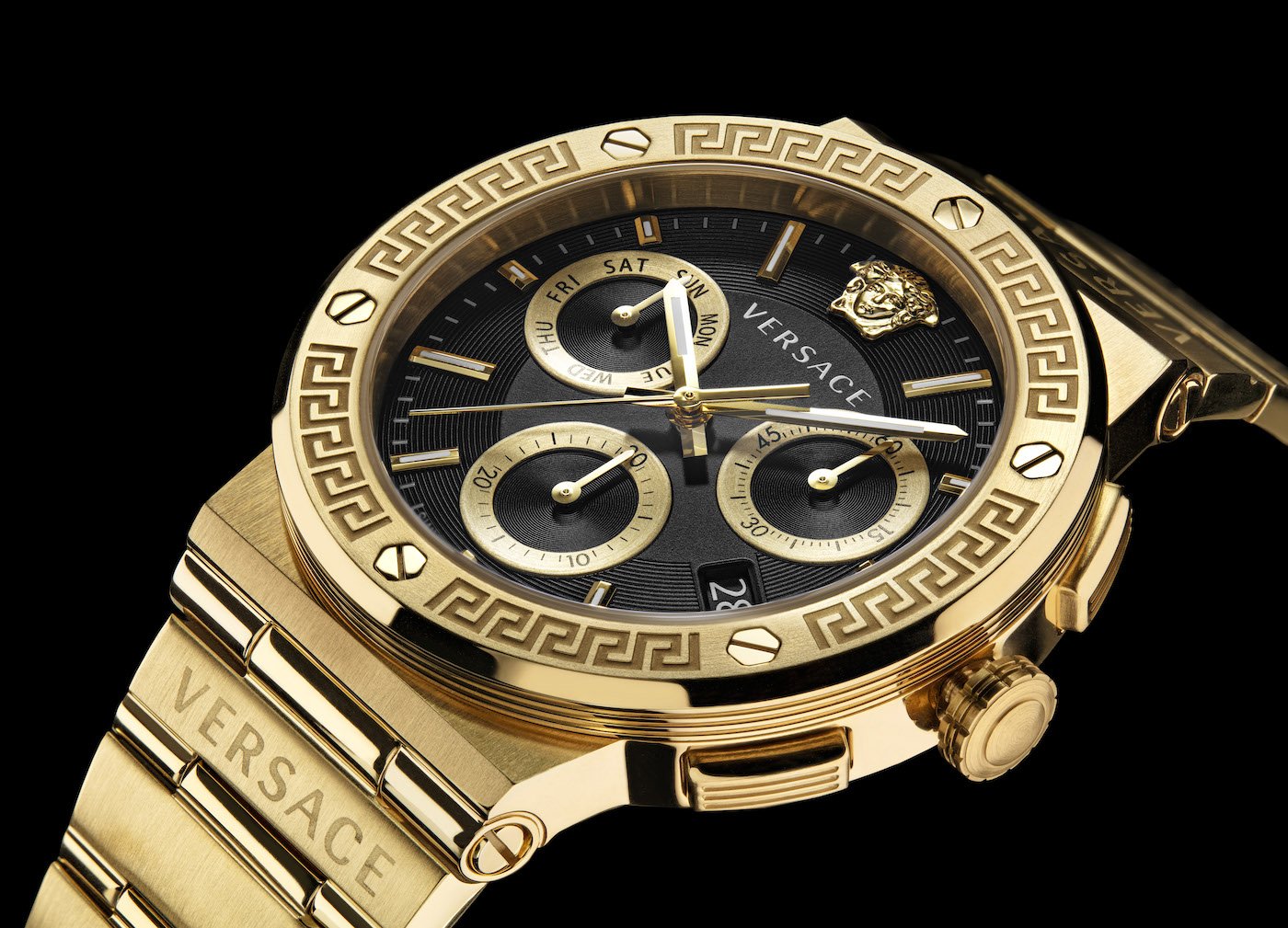 The iconography is reinforced by the engraved Greek Key on the top ring, punctuated by six screws, as well as by the Versace logo alternately repeated on the bracelet horizontal links.