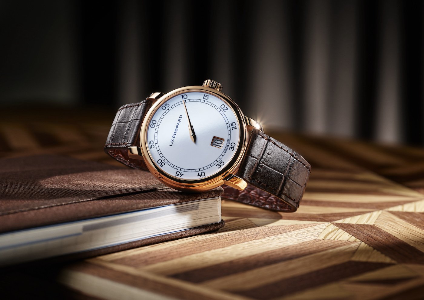 The power reserve on the back of the movement is visible through the transparent sapphire crystal caseback, which also displays the beautiful, classical architecture of the calibre. The grand feu enamel dial – streamlined, sober and pared down to the essentials – was produced entirely in-house by Chopard Manufacture’s artisan enameller on an 18K ethical rose gold base. Finely polished after firing at high temperature (820°C), it is slightly convex, all the better to catch the light. On this immaculate base appear the logo L.U.CHOPARD, the railroad-style minutes track and Arabic numerals, also enamelled, in black.