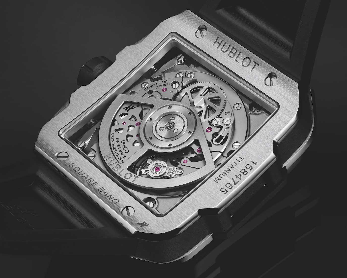 - As with the Big Bang, the Square Bang’s dial makes extensive use of sapphire to give a clear view of the Unico movement, and also reuses the same hands. We also find the six (functional) screws on the bezel, placed at exactly the same places as on the Big Bang.
