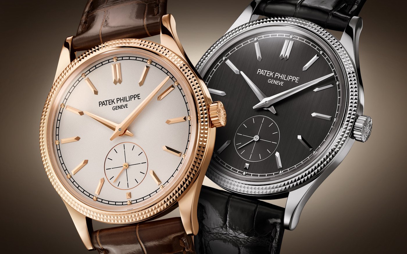 - Patek Philippe’s most contemporary Calatrava comes in two versions: the Ref. 6119R-001 (pictured here) combines a rose-gold case with a silvery grained dial as well as applied hour markers and hands in rose gold. The Ref. 6119G-001 in white gold subtly plays with light on a charcoal gray dial with attractive contrasts – a vertical satin finish interrupted by the snailed subsidiary seconds dial.