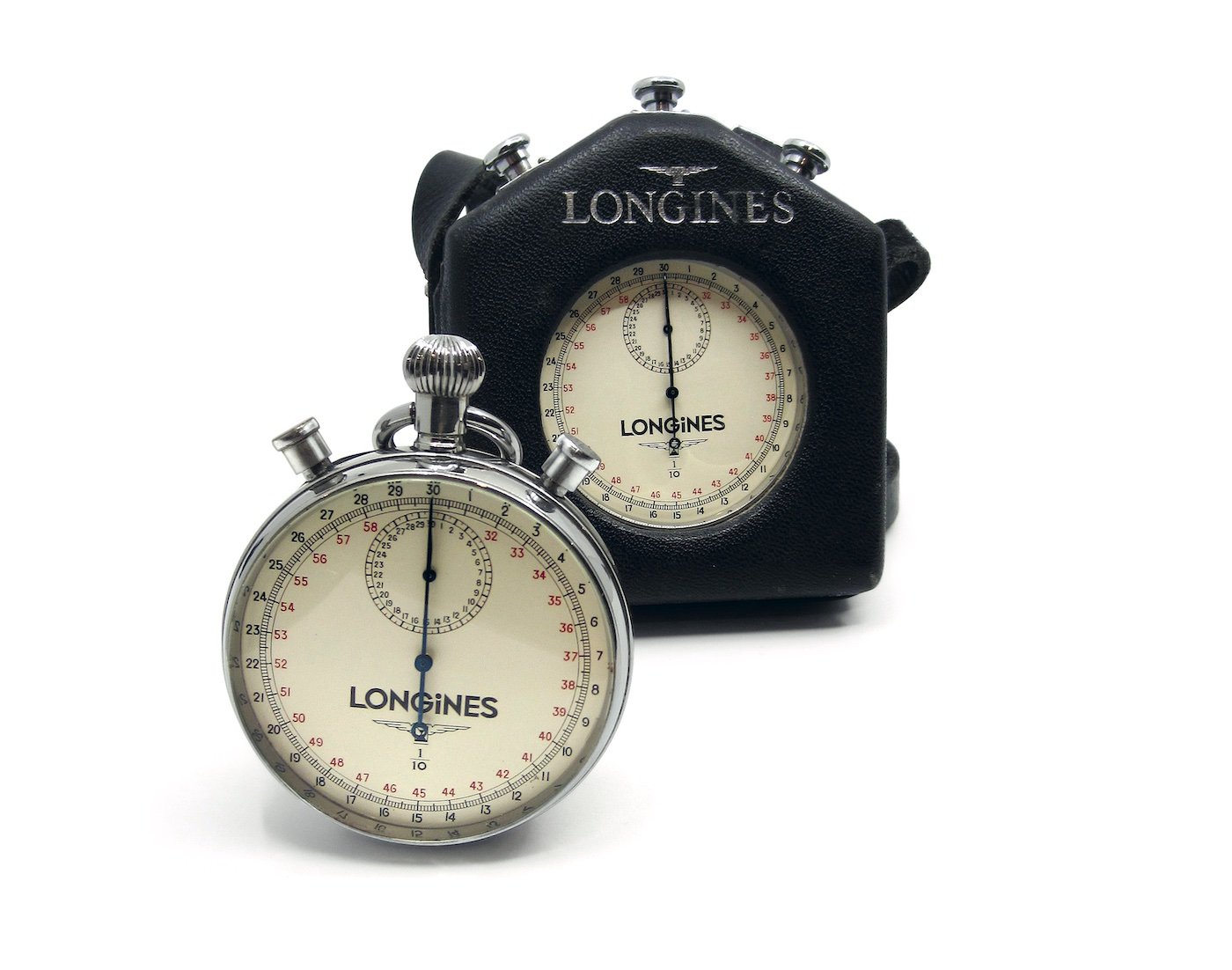 In 1939, Longines introduced the famous “High-Frequency Skiing Timer” equipped with a 36,000 vph movement capable of measuring tenths of a second, which was to become the standard in sports timekeeping. Longines’ dominance of high-frequency movements and sports timekeeping continued into the 1950s and 1960s, when a number of different models were launched, including the Ref. 7411 stopwatch with 1/10-sec flyback mechanism, which could measure and display hundredths of a second.