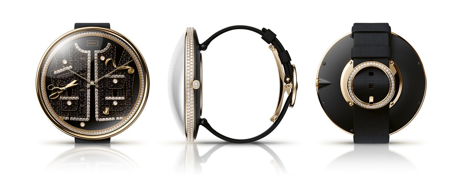 Mademoiselle Privé Pique-Aiguilles Tweed Motif watch Limited to 20 pieces. Case in 18K yellow gold set with 211 brilliant-cut diamonds ( 2.79 carats) and titanium with black coating. 18K yellow gold caseback. Black-lacquered dial decorated with a black tweed-effect jacket pattern, trimmed with 92 brilliant-cut diamonds ( 0.96 carat), 4 pearl-buttons and 18K yellow gold hand-sculpted miniature tools set with 1 diamond ( 0.01 carat). Encircled by 120 brilliant-cut diamonds ( 0.71 carat) and a 18K yellow gold miniature chain. 18K yellow gold hands set with 1 brilliant-cut diamond in the centre ( 0.01 carat). Produced by LES CADRANIERS DE GENEVE, owned by FP Journe. 18K yellow gold crown set with 10 brilliant-cut diamonds ( 0.03 carat). Black matte grosgrain strap and 18K yellow gold buckle set with 45 brilliant-cut diamonds ( 0.27 carat). High-precision quartz movement. Function: hours, minutes. Water-resistance: 30 metres. Diameter: 55 mm. Diamonds: 480 brilliant-cut diamonds ( 4.78 carats).