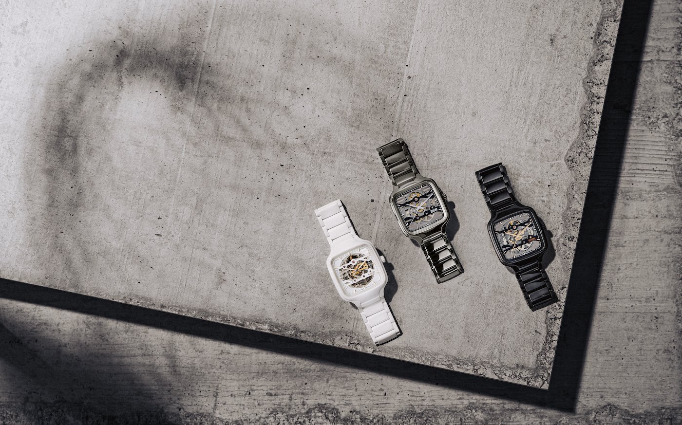 The True Square Skeleton takes up the iconic square look that has long been closely associated with Rado, enhanced by a splendid example of the “Art of Skeletonisation”. All references present the collection’s clear, spare design. Parallel horizontal lines divide the dial into three sections, highlighting geometric harmonies and key parts of the movement.