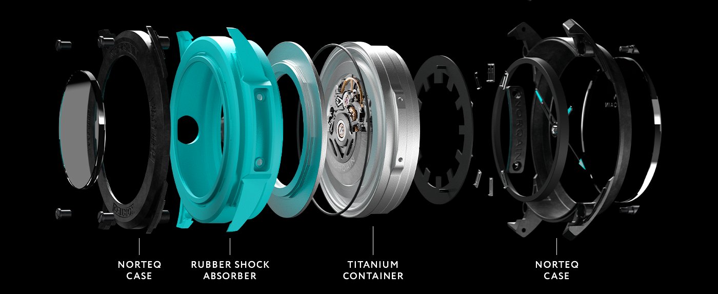 Like its predecessors, this watch features a rubber shock absorber encapsulating the titanium container where the skeletonised NN08S movement ticks away.