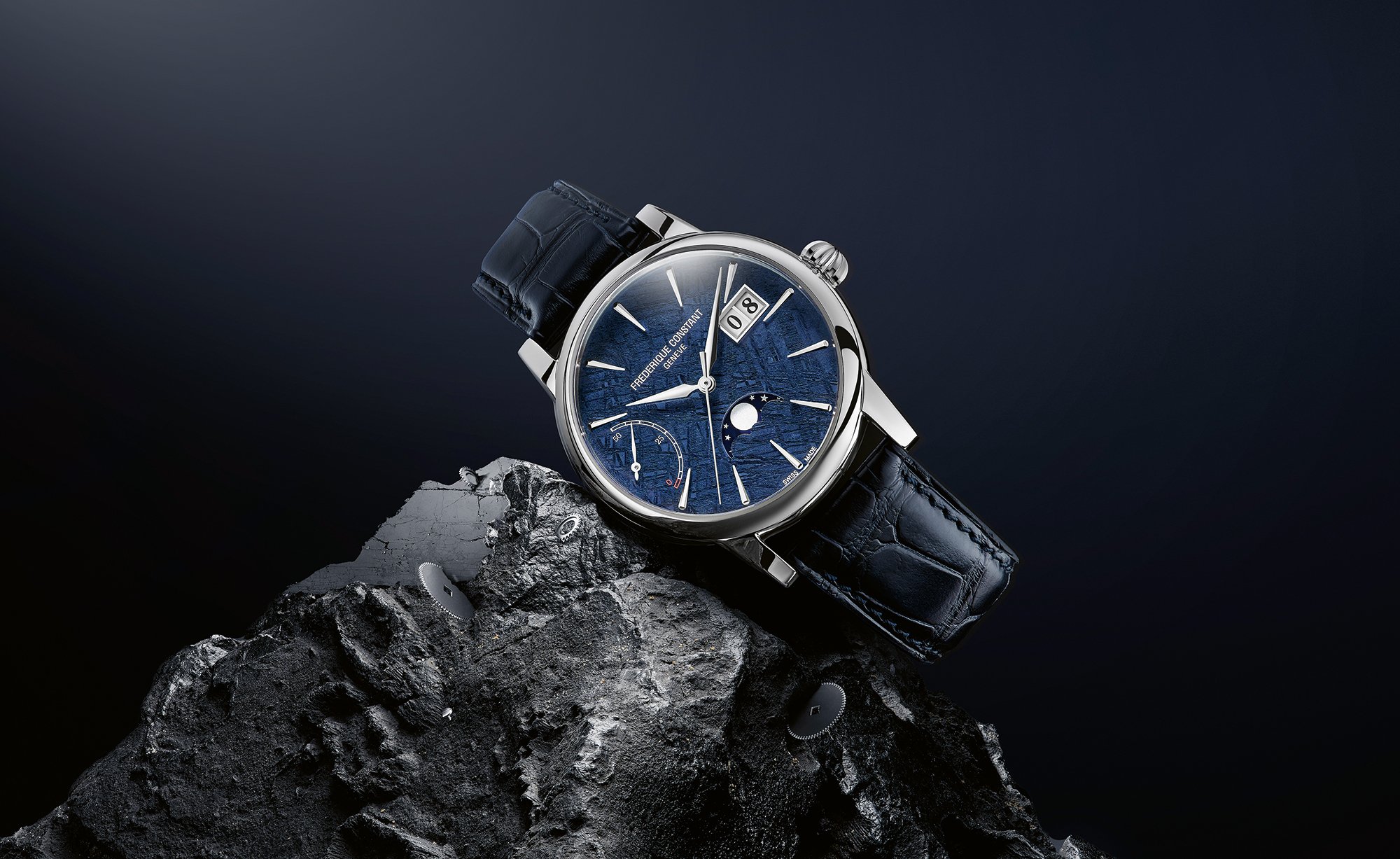 Frederique Constant has taken care to ensure that this calibre, like all its others, is easy to operate: the three complications, time set function and winding mechanism are all adjusted via the crown at 3 o’clock. With no pushers, correctors or styluses, the FC-735 movement is resolutely modern. Four editions have been introduced. The first two, featuring a platinum case and meteorite dial or a rose gold case and anthracite dial, come in limited editions of 35 and 350 respectively. The two others, with a steel case and a blue or silver dial, will form part of the brand’s standard collection.
