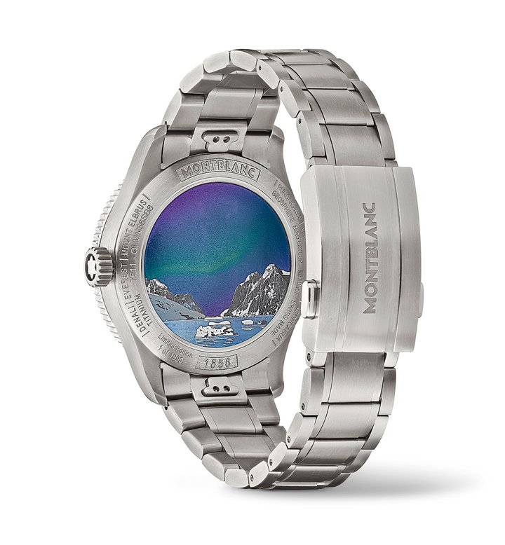 To celebrate the full beauty of the South Pole, Montblanc has added an engraving of the Aurora Australis on the caseback over Antarctica’s Paradise Bay, famous for its emperor penguins and whale spotting points, as well as for being one of the coldest and windiest places on Earth.
