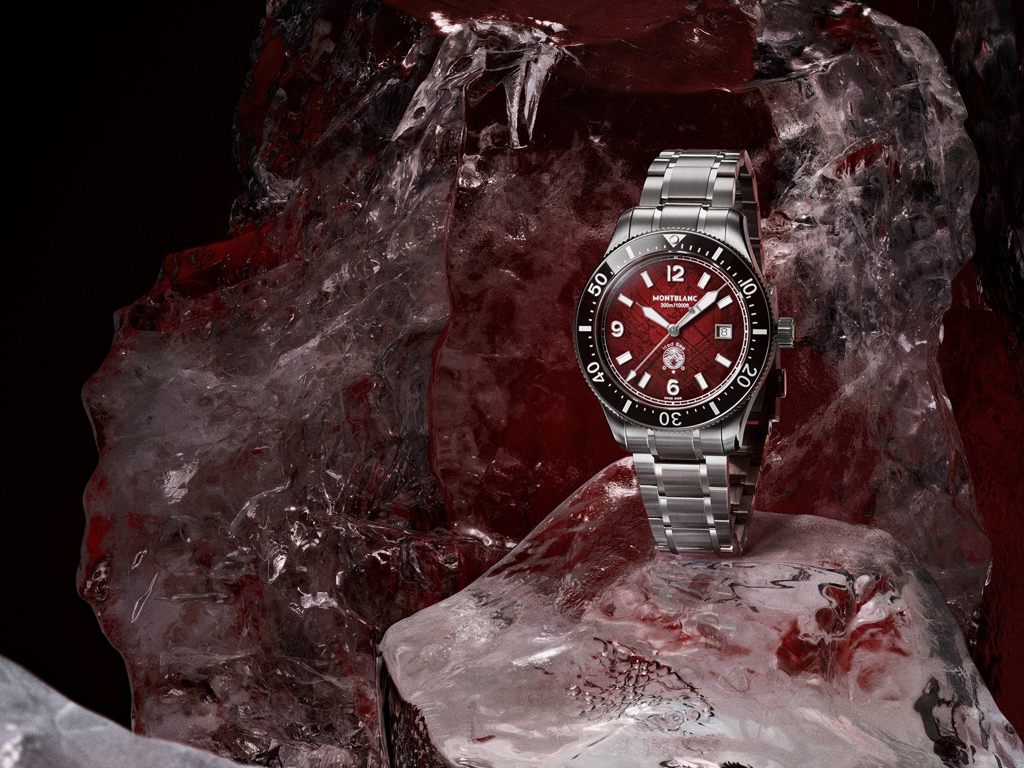 Another new version features a brand-new burgundy dial inspired by the deep red of the evening sun as it hits a glacier. This model is paired with a black ceramic unidirectional bezel and an adjustable stainless-steel bracelet.