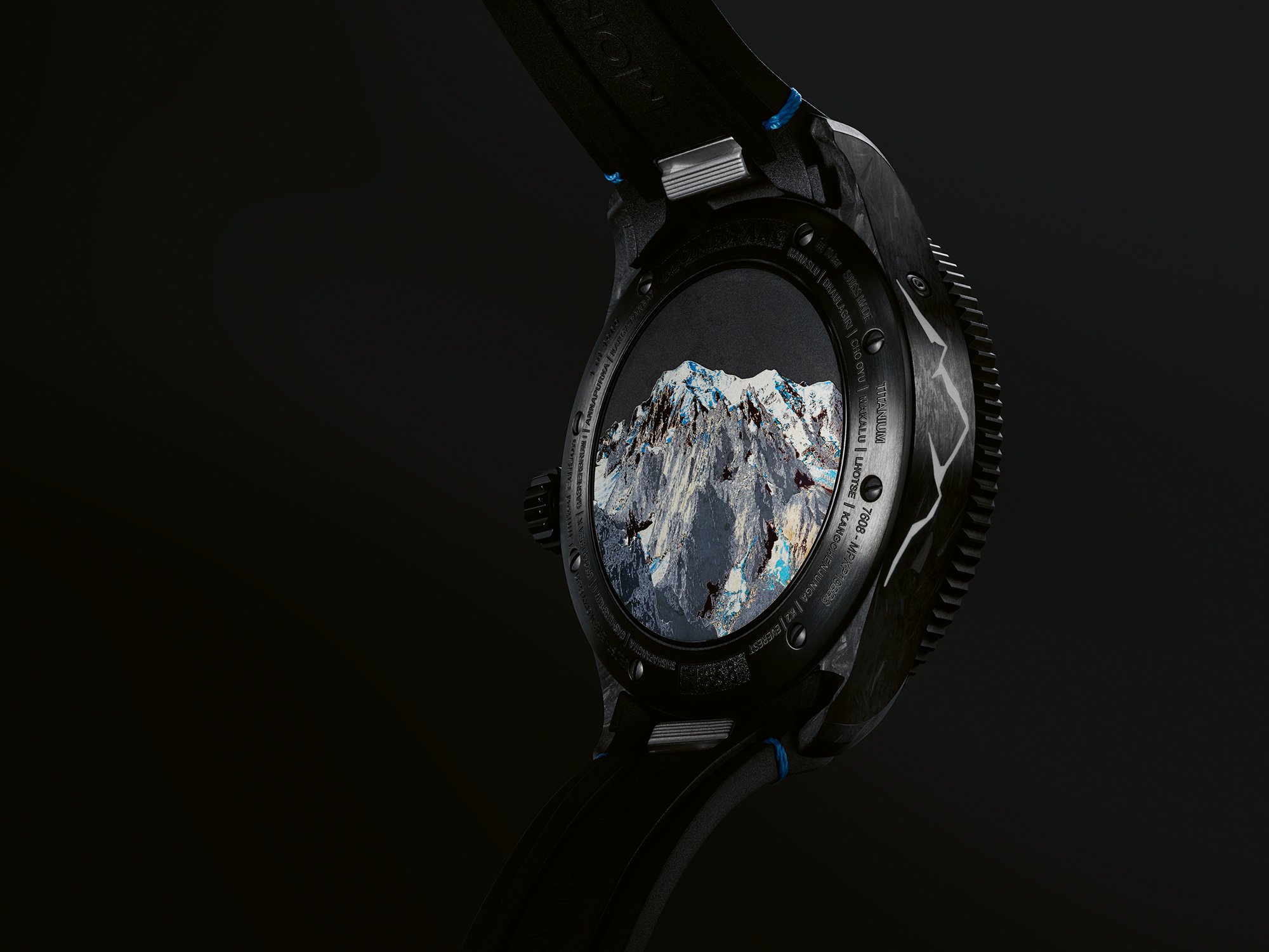 Reinforcing the adventure theme, the 43.5 mm titanium and CARBO2 case has a luminous blue outline of Mont Blanc engraved on the side, visible only to the wearer. The older a glacier is, the less oxygen it contains and the denser it becomes, resulting in a deeper blue colour. This is reproduced on the case band, shining white by day and luminous blue by night. To achieve this result, Super-LumiNova® and a layer of protective varnish are carefully applied by hand. An image of Mont Blanc is also featured on the titanium caseback, created using Montblanc’s 3D laser technique to capture the peak’s colour, depth and realism.