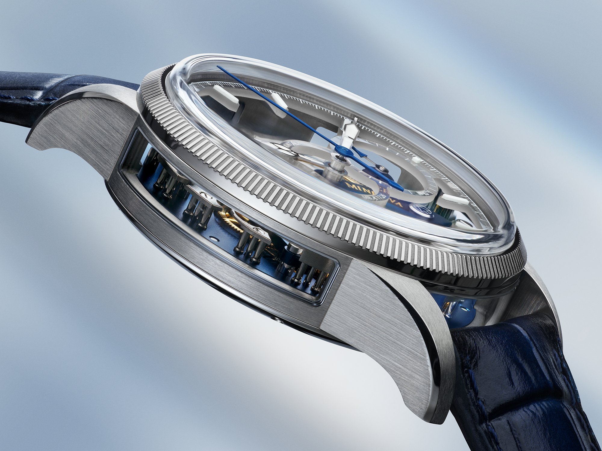 Finally we come to Minerva, whose heritage Montblanc has continuously reinterpreted since acquiring the legendary Swiss manufacture. The brand is presenting a variation on its 1858 The Unveiled Minerva Monopusher Chronograph. This new 100-piece limited edition features five apertures in the case band, allowing light to flood into the hand-finished, manually wound movement so the wearer can fully appreciate its 291 components. It’s powered by the new Calibre MB M17.26.