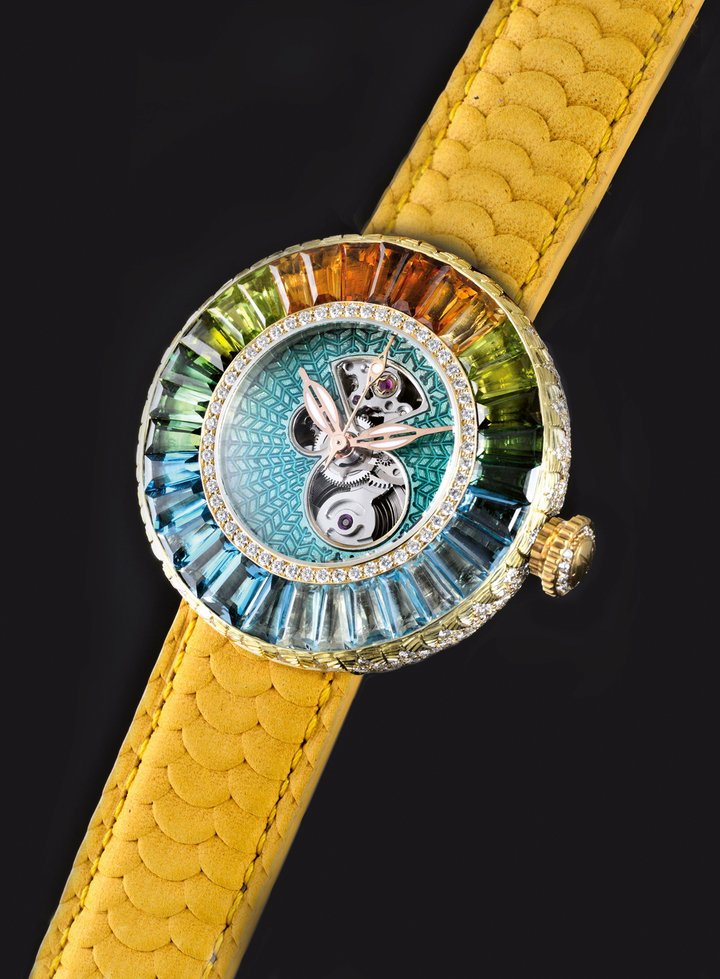 he Discobolo Rainbow Multicolor Jewel is a testament to Zannetti’s dedication to creating timeless pieces that inspire and captivate. Featuring an engraved and enamelled case adorned with vibrant multicoloured sapphires and precious stones, this watch exudes a mesmerising allure that captures the imagination.
