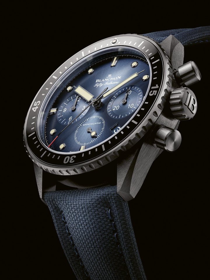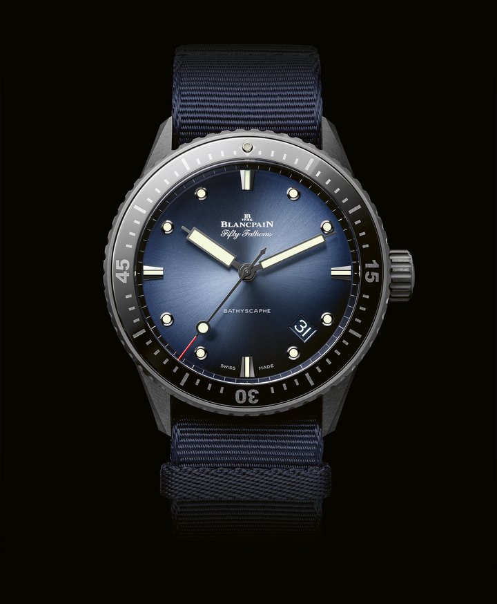 The introduction of these new models to the Fifty Fathoms Bathyscaphe line revitalises the selection of ceramic timepieces launched earlier this year. There are now three references to choose from, (flyback chronograph, three-hand plus date and complete calendar with moon-phase) featuring three different dials (blue, green and black) along with a generous choice of wristbands (sail-canvas and NATO straps along with a fine ceramic bracelet that is highly complex to produce).