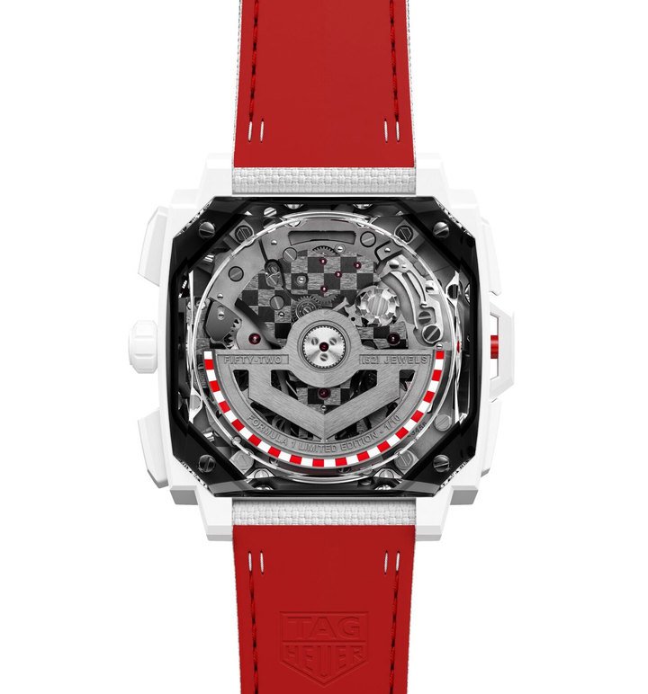 To celebrate these milestones, the brand is presenting a bold take on the original timepiece from 1969: an exclusive limited edition of only 10 pieces, the TAG Heuer Monaco Split-Seconds Chronograph | F1® is made of cutting-edge materials such as white ceramic and sapphire crystal. The extensive use of the latter creates a seamless fusion between the case and the calibre. Notably, the caseback is crafted from a single piece of sapphire crystal, offering unobstructed views of the intricate Calibre TH81-00 within, creating a mesmerizing visual experience.