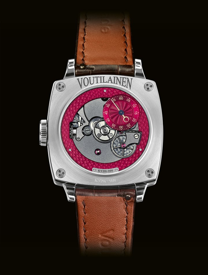 - Voutilainen KV20i Reversed CS: Voutilainen’s rare inverted movement, with its two direct-impulse escape wheels and single-arm balance bridge, is on full show on the dial side of the KV20i Reversed CS, with its display of hours and minutes. The workshop’s trademark hand-guilloché decoration has also been “reversed”, appearing on the chapter ring and subsidiary seconds on the back, in a striking, almost provocative, cherry red. The 39mm case housing the movement adopts a bold cushion shape. Finished with alternating brushed and polished surfaces, it extends into short, curved lugs. This contemporary form is a direct descendant of the Voutilainen TP1 pocket watch for Only Watch 2019, created by Kari Voutilainen with his daughter Venla – who convinced him to add bright orange accents. A forerunner to this particularly vibrant crimson.