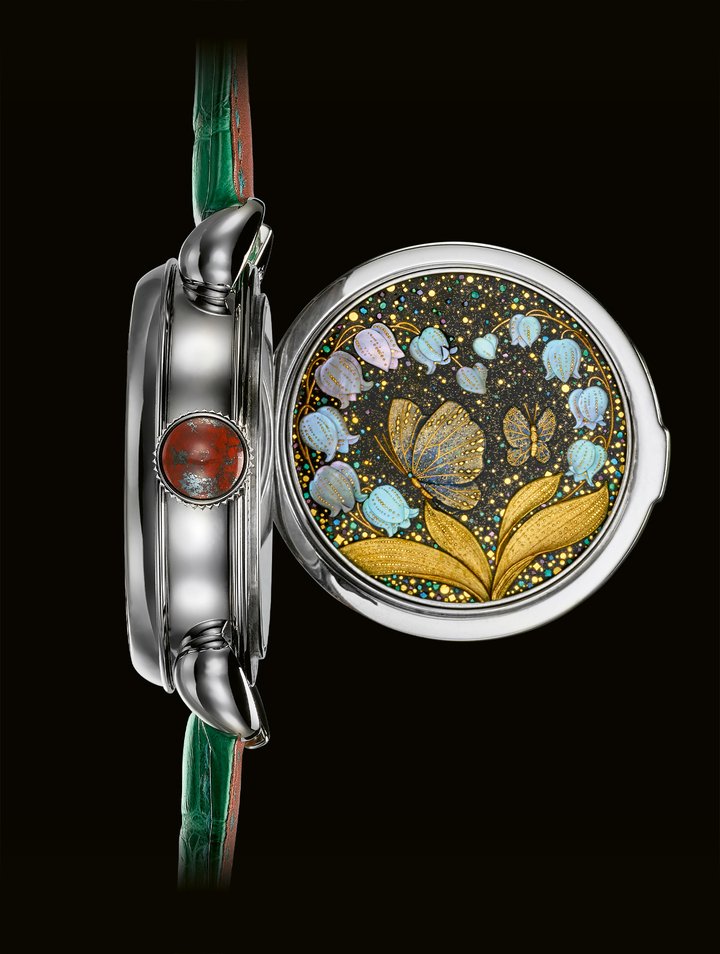 - Voutilainen 28 Kohan Unique Piece: where to begin when describing this watch, crafted at the request of a Finnish collector as the gift of a lifetime for his wife? Every inch of the decoration, on the dial, the case, the inside and outside of the cover and the movement itself, is how he asked for it to be. Depictions of Lake Saimaa adorn the dial, a Finnish autumn recreated in miniature. On the outside of the cover, two seven-spotted ladybirds, Finland’s national insect, have landed on a silver birch leaf (the country’s national tree). The inside is adorned with lily-of-the-valley, the national flower, and the country’s national butterfly, the holly blue, shown wings spread in search of nectar. An attentive eye will take in the wealth of detail inscribed on the white gold case, such as a tiny map of Finland, a bear’s pawmark (the Finnish national animal) and the lady’s birthday, as well as on the movement itself, with its richly decorated ratchet wheel and bridge… not forgetting an amusing reference to Madam’s favourite water, with a power-reserve indicator in the form of a Vichy mineral water bottle!
