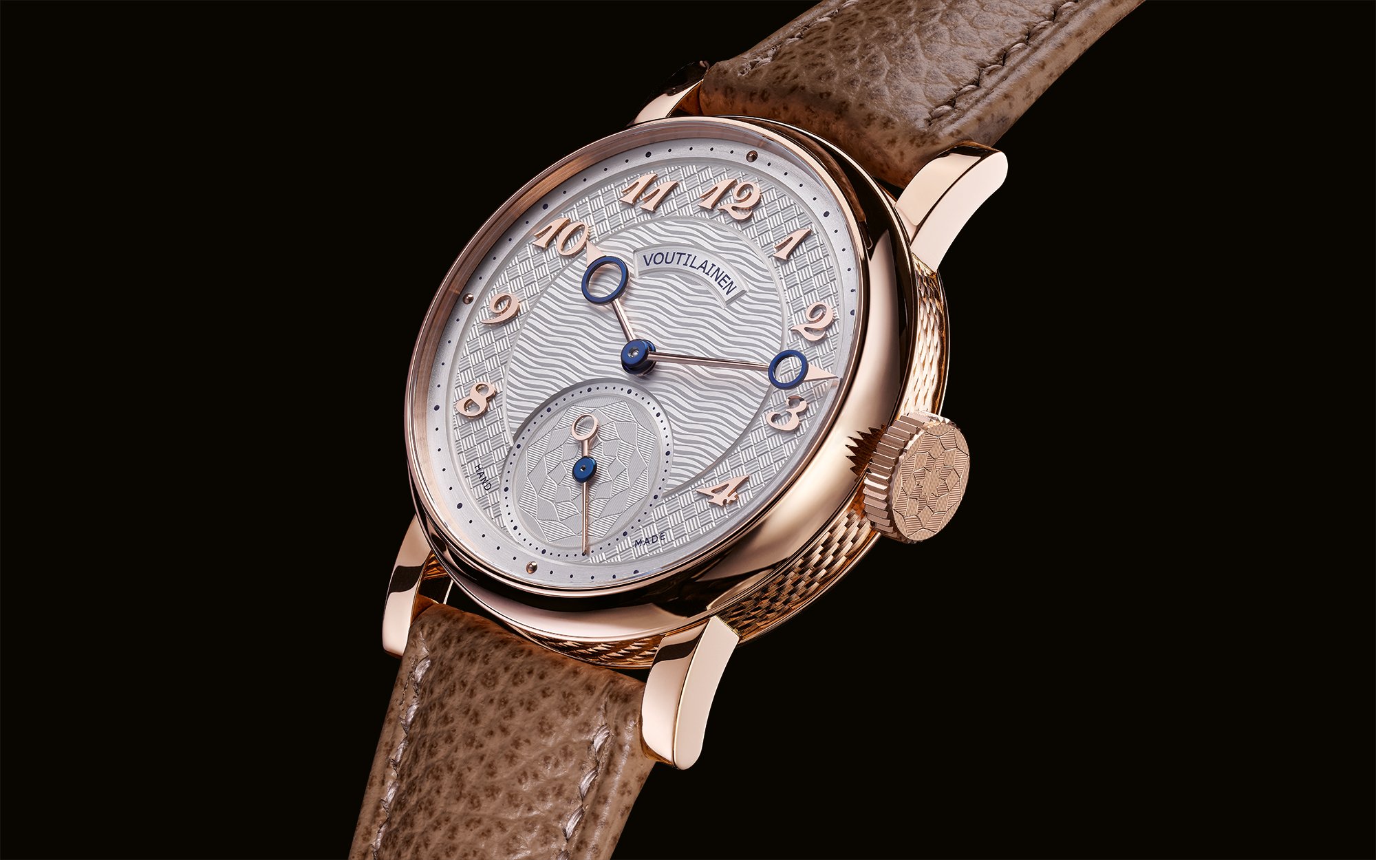 - Voutilainen 28 CG, 37mm: the Voutilainen 28 CG is a vibrant tribute to the classical art of hand-guilloché. The guilloché patterns and textures on the white dial, the 37mm case in rose gold or platinum, together with the crown, exude refined elegance. They are the work of Brodbeck Guillochage (whose logo appears on the crown and small seconds), recently inaugurated by Kari Voutilainen (and extensively covered by Europa Star) as a place where this rare craft can thrive. The 28 calibre is designed, built, made, finished and assembled at the Voutilainen workshops. Two escape wheels give direct impulse to the large balance via the impulse roller. This innovative construction provides greater energy efficiency and offers significant benefits of longevity, stability and power reserve.