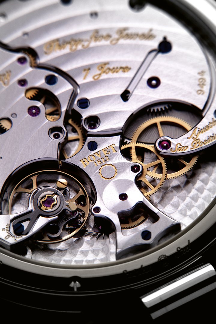 The in-house, manufacture movement powering the timepiece, seen through the sapphire crystal exhibition back (pioneered by the House in the 1800s) is finished on par with Bovet’s highest complications and boasts seven days of power reserve from a single barrel. Over 95% of the components are manufactured in-house at the Tramelan facility, and all timepieces are re-tested and final assembled in the Bovet castle in Môtiers.