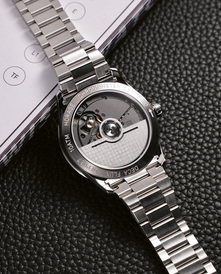 The DecaFlux offers COSC-certified accuracy of -4 /+6 seconds per day. It is available in two dial iterations. Constructed from 316LMo stainless steel, the 40mm case frames the dial, with a polished black option under a sapphire crystal with five layers of red-tinted anti-reflective coating, and a Sunray Blue option with a sapphire crystal and five layers of blue-tinted anti-reflective coating.