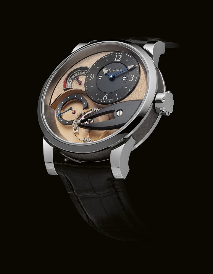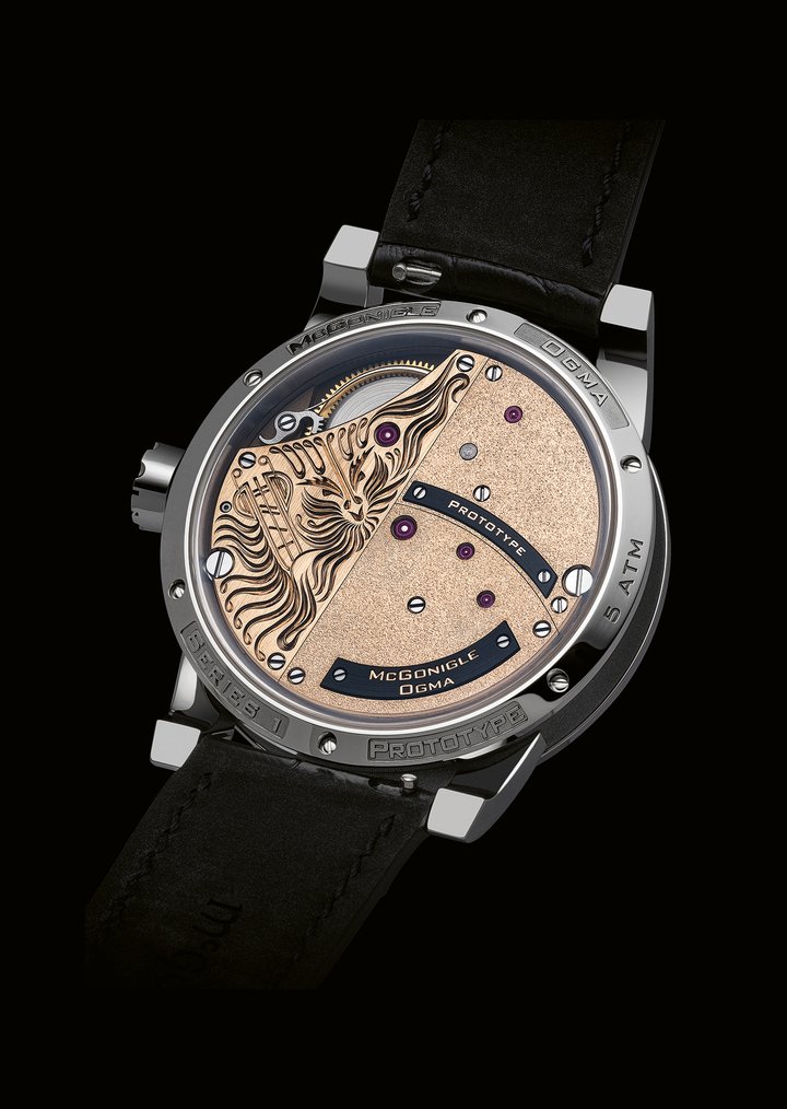 The German silver barrel bridge carries a specially commissioned engraving of Ogma, designed by artist Frances McGonigle, which gives the mechanism a narrative richness that resonates with the watch’s mythological namesake. At 39.3mm, the Ogma is the smallest McGonigle to date and the most contemporary in design. The initial series of 20 pieces in tantalum is sold out (sight unseen) but the second series, in rose gold, also limited to 20 pieces, is still available.