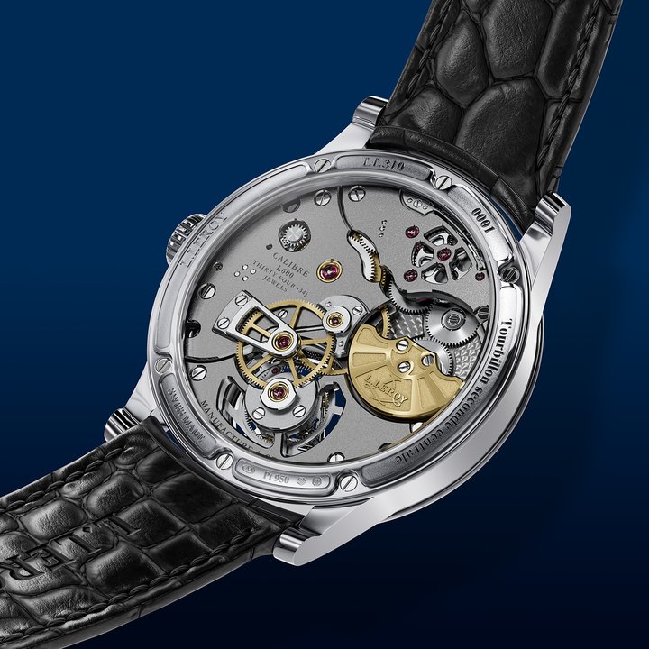 Apart from the beauty of its finishes, the real star of the dial is undoubtedly the eye-catching flying tourbillon positioned at 6 o’clock. Visible through an opening that showcases its complexity and allure, it is adorned with a mirror-polished titanium bridge bearing the intertwined double “L” monogram.