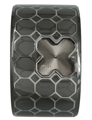 Polished steel with Elasten 3000 bracelet. Two quartz movements, hours, minutes, second time zone, brushed, silvered dial, hardened mineral crystal. Designed by Georg Plum.