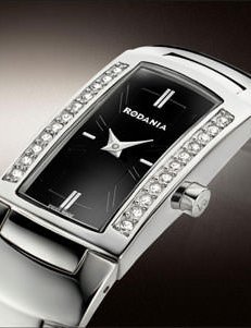 White metal watch and adjustable bracelet, quartz movement, black dial.
