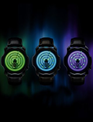 Watch (41 mm) in modified Stavax ESR steel (3 x harder than normal steel) and equipped with a mechanical ETA Calibre 2824-A2 self-winding movement finished by Sarpaneva. Gold-plated or aluminium dial, blued steel hands, sapphire crystal, 42-hour power reserve, water-resistant to 30 metres.
