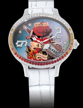 18 carat white gold case equipped with hand-winding movement with a flying tourbillon (1 minute) with a blued bridge on the going barrel. Rhodium bridges of the gear train and the tourbillon engraved with floral decoration, sapphire crystal front and back, Louis XV crown, 72-hour power reserve.