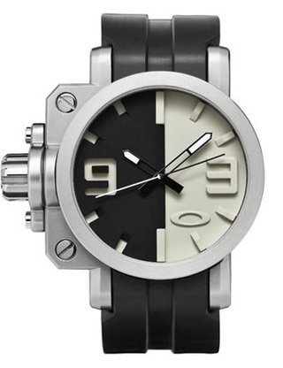 Stainless steel chronograph equipped with a Swiss made quartz movement. Eight hand analogue display, alarm, big date by mechanical display, screw-down caseback, anti-reflective sapphire crystal, rubber strap and water resistant to 100 metres.