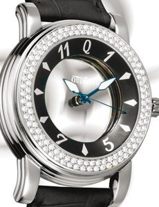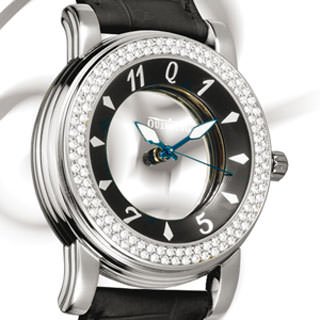 Movement Invisible, hand-wound, compensating for effects of synergy, driven by 2 stepping motors, comprising 9 layers of parallel sapphires. Functions Hours, minutes and seconds. Case Stainless steel, 18K yellow, white or pink gold, individually-numbered and engraved, 39 mm. Round or octagonal bezel. External bezel and internal flange with or without diamond setting. Anti-reflective sapphire crystal front and back. Water-resistant to 50 m. Dial Available in black, white, red, blue, steel, brown, or with diamond setting. Anti-reflective metallic sapphires. Luminous or dauphine hands. Bracelet/Strap Alligator with Quinting clasp.