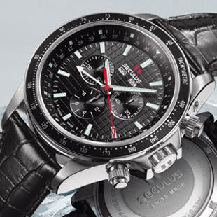 Movement Ronda 5040-F quartz. Functions Hours, minutes, seconds, day, date, month, 1/10 second chronograph and tachometer scale. Case Stainless steel, 46 mm. Bezel with tachometer. Scratch-resistant sapphire crystal. Water-resistant to 100 m. Dial Black, white, blue or brown. Luminescent hands and hourmarkers. Hour, minute and small seconds counters at 6, 9 and 3 o’clock respectively. Day and month windows at 12 o’clock, date at centre. Bracelet/Strap Genuine leather, safety folding clasp.