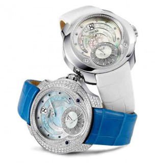 Movement Self.winding, Fvt28 calibre, 27 jewels, exclusive Franc Vila “Gold Concept” rotor, 42-hour power reserve. Functions Jumping hours, minutes and seconds. Case DieHard Extreme steel in special “Esprit Unique” shape, with elliptical and circular bezel. Blue version: bezel and horns set with 387 pure TW VVS diamonds (2.45 cts) and 2 sapphires. White version: interior setting of the bezel with 91 diamonds (0.7 ct) and 2 diamonds. Sapphire crystal front and back with anti-reflective coating on both sides. Water-resistant to 100 m. Dial Blue or white mother-of-pearl. Transfer “IVY” floral pattern. Hourmarkers set with 8 sapphires or 8 diamonds. Jumping hour window at 12 o’clock. Small seconds at 6 o’clock. Bracelet/Strap Blue or white hand-stitched alligator with DieHard Extreme steel buckle.