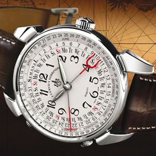 Screw-down transparent back. Water-resistant to 30 m. Dial Vintage white. Central hour, day, date, month and week display. Bracelet/Strap Louisiana alligator with stainless steel folding clasp.