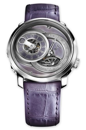 18-carat white gold 41mm timepiece equipped with Hautlence’s self-winding mechanical movement showing jumping hours and retrograde minutes over 180º. 40-hour power reserve, multi-level mother-of-pearl dial, hand-stitched purple alligator strap with square scales, 18-carat white gold buckle and water resistant to 30 metres. This new feminine collection is also available set with diamonds and in a vast choice of colours. Limited edition of 88 pieces per model.