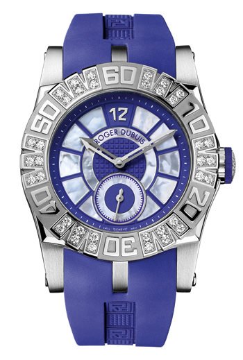 Steel 40mm timepiece equipped with an RD 821 movement. Hours, minutes, small seconds at 6 o’clock, purple dial with Clou de Paris design and mother-of-pearl sectors, white gold Arabic numerals, 36 diamonds on the stamped bezel totalling 1 carat, stamped caseback, rubber strap, adjustable deployment buckle, water resistant to 30 metres and limited to 888 pieces.