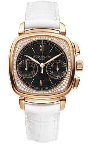 Rose gold chronograph equipped with Patek Philippe’s mechanical, manually wound, CH 29-535 PS calibre. Central chronograph hand, 30-minute elapsed time counter, seconds sub dial, dial flange set with 136 diamonds totalling approximately 0.58 carats, black dial with guilloché, white alligator strap and Patek Philippe Seal.