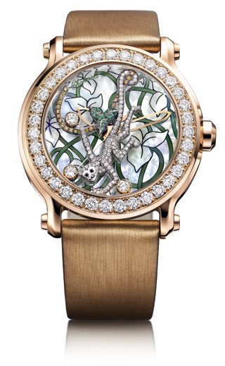 18-carat rose gold timepiece to celebrate Chopard’s 150th anniversary in support of the World Wildlife Fund. Gold monkey with full pave setting of diamonds, mother-of-pearl dial, diamond-set bezel, Chopard’s signature mobile diamonds, skeleton hands, satin strap and 18-carat rose gold buckle. There are 15 watches in the collection, each depicting a different animal.