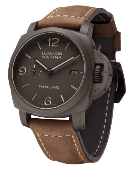 Brown Panerai composite timepiece equipped with the brand’s P.9000 in-house calibre with three-day power reserve. Hours and minutes; small seconds at 9 o’clock; date at 3 o’clock; brown dial; luminous Arabic numerals and hour markers; sapphire crystal with anti-reflective coating; personalised leather strap; large-size Panerai buckle; water resistant to 300 metres.