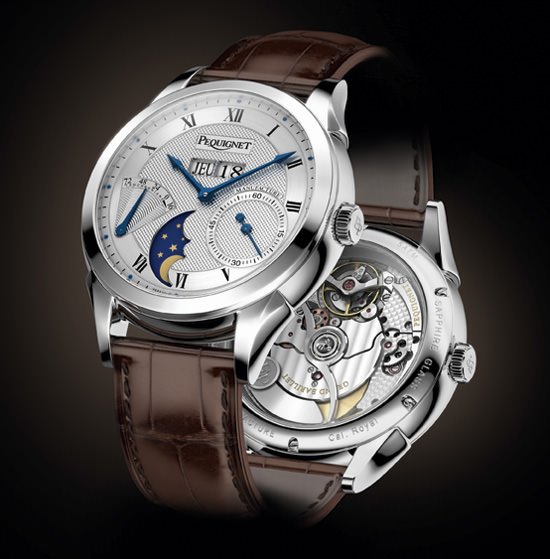 Automatic timepiece equipped with an in-house manufactured Calibre Royal with 72-hour power reserve guaranteed. Hours, minutes, small seconds at 4 o’clock, large day and date, large accurate moon phase at 6 o’clock, oscillating weight with sunray finish with rhodium plating, bridges and main plate circular-grained with snail design and Côtes de Genève.