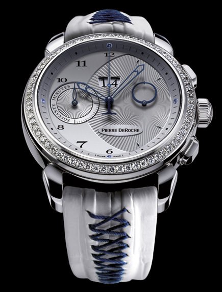 Polished and satin-finished 42.5 mm steel timepiece fitted with a Dubois Dépraz automatic movement decorated with an engraved rotor. Hours, minutes and seconds; large date; chronograph with 60-minute counter; silvered, sunray dial; diamond-set bezel with 64 diamonds (1.28 carats); screw-down crown, double-sealed push pieces; anti-reflective sapphire crystals front and back; crocodile strap; water resistant to 100 metres.