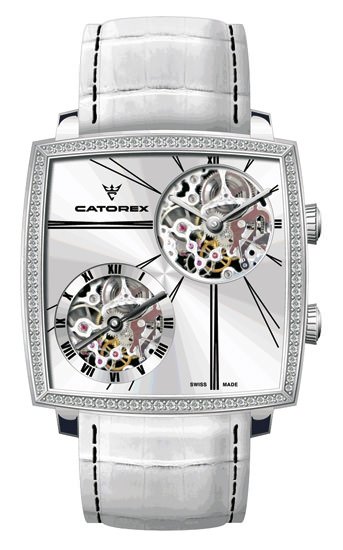 316L Stainless steel 42 mm timepiece equipped with two hand-winding mechanical movements (calibre 83/4 Unitas 6565 from the 1960s). Reconditioned, skeletonized and engraved movement with circular-grain pattern on the top, Côtes de Genève motif on the back and rhodium treatment; two time zones, bezel set with 80 VVSI diamonds; curved sapphire crystal on the front; flat sapphire crystal on the back, genuine Louisiana alligator strap and water resistant to 30 metres. Limited to 399 pieces.