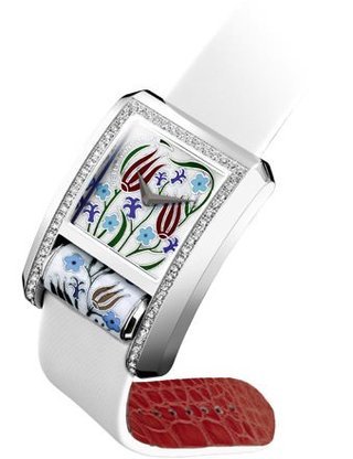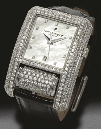 White gold rectangular timepiece equipped with an ETA 2004-1 automatic movement. Hours, minutes and seconds in the centre; date at 6 o’clock; 40-hour power reserve; rotating carrousel; 50 mm x 35 mm x 11 mm; 552 diamonds graded G VVSI (12.75 carats) on the case and cylinder; alligator strap; diamond-set buckle; water resistant to 50 metres.